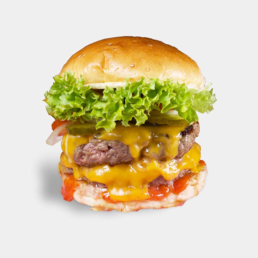Zwei frisch gegrillte Beef Patties (à 160 g), doppelte Ladung geschmolzener kräftiger Cheddar Cheese, Tomate, Salat, Gewürzgurke, Zwiebeln, Ketchup, Honigsenf